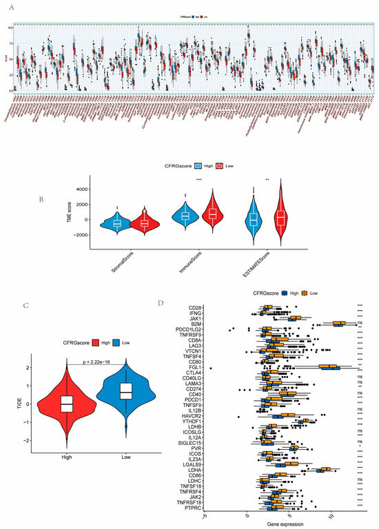 Testing of a CFRG score prognostic model of HCC. (A) Differences in drug sensitivity between two CFRG score groups. (B–D) TME state, TIDE score, and the expression levels of ICGs between the two CFRG score groups. * p < 0.05; ** p < 0.01; *** p < 0.001; ns, not statistically different.