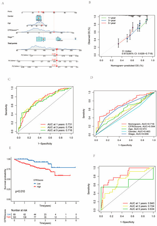 A nomogram was established to test the CFRG score hypothesis (Figure 6A), and its accuracy (C-index = 0.672) was further verified (Figure 6B). The area under curve (AUC) values were 0.731, 0.734 and 0.716 at 1, 3, and 5 years, respectively (Figure 6C), respectively. In the receiver operating characteristic (ROC) curve including nomograms, the CFRG score, and clinical factors (age, gender, and tumor stage), the AUC value of nomograms (AUC value = 0.716) is the highest (Figure 6D). As such, the nomogram could enhance the prognosis performance of the CFRG score model. The result of the ICGC dataset showed that survival probabilities of patients were significantly worse in the high-CFRG-score group (Figure 6E) and the AUC values were 0.834, 0.724 and 0.634 at 1, 3, and 5 years, respectively (Figure 6F).