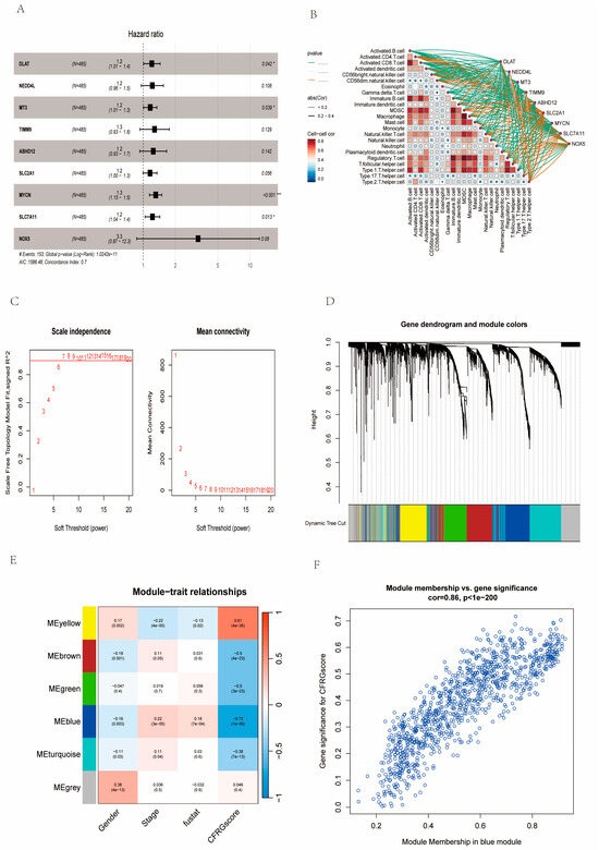 Identification of signature genes by WGCNA and CFRG score grouping. (A) Multivariate COX regression analysis of the informative genes. (B) The correlation analysis between these eight genes with immunological cells. (C) A map illustrating scale independence and mean connectivity with a soft threshold is presented. (D) The methods of dynamic tree cutting and dynamic merging are used to cluster the families among different modules. (E) Average correlation between various modules and gender, stage, survival state, and CFRG score. (F) The correlation between gene significance in the CFRG score and module membership in the turquoise module.* p < 0.05; *** p < 0.001.