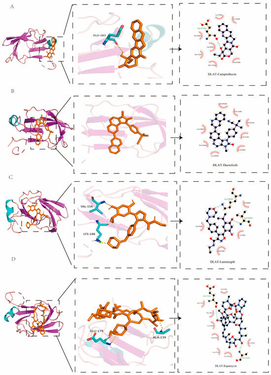 Three-dimensional (3D) and two-dimensional (2D) structure of the molecular docking results between DLAT and candidate drugs (A) camptothecin; (B) dactolisib; (C) luminespib; (D) rapamycin. Candidate drugs were displayed in brown, and molecular bonds (hydrogen) were marked in yellow (3D). Green dotted lines indicated hydrogen bonding (2D).