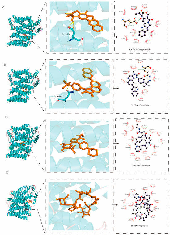 Three-dimensional (3D) and two-dimensional (2D) structure of the molecular docking results between SLC2A1 and candidate drugs (A) camptothecin; (B) dactolisib; (C) luminespib; (D) rapamycin. Candidate drugs were displayed in brown, and molecular bonds (hydrogen) were marked in yellow (3D). Green dotted lines indicated hydrogen bonding (2D).