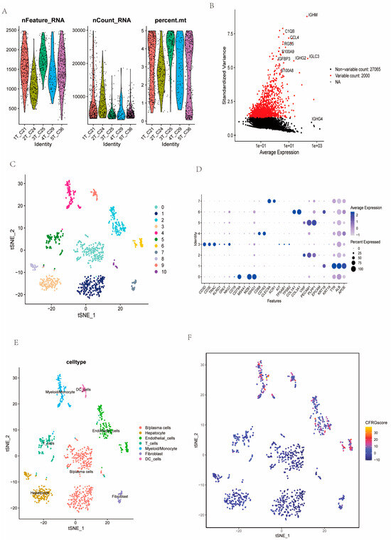 The single-cell dataset GSE242889 with five tumor samples were selected and then normalized after quality controls (Figure 10A). After dimensionality reduction conducted by PCA, we screened the top 1500 high variable genes and annotated the top 10 genes (Figure 10B), and 11 cell clusters were obtained eventually by the t-SNE algorithm. Via differential analysis across the whole cell clusters, these cell clusters were annotated into B/plasma cells, hepatocytes, T_cells, myeloids/monocytes, endothelial_cells, fibroblasts, and DC_cells, respectively (Figure 10C–E). The CFRG scores were higher in endothelial cells, DC_cells and myeloid/monocyte cells (Figure 10E,F).