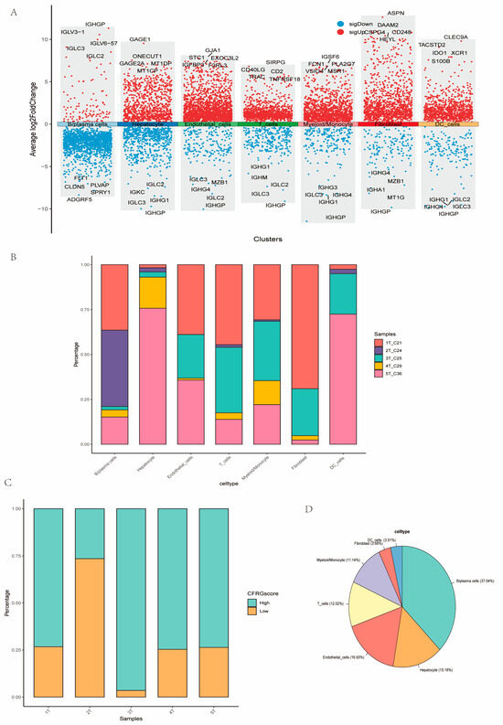 DEGs labeled among different types of cells and cell proportions in the samples. (A) The differential expression genes labeled among the cell types. (B) The percentage of different cell types in the samples (C,D) The proportion of the high- and low-CFRG-score group in the five samples.