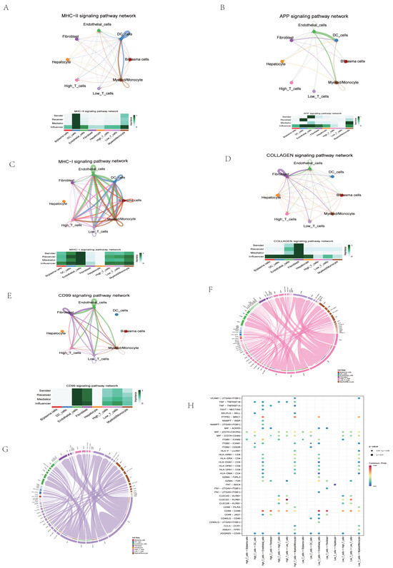 Intercellular communication difference between high- and low-CFRG-score T cells. (A–E) MHC−II, APP, MHC−I, COLLAGEN, and CD99 signaling pathway networks displayed by circus plots and the roles of various cell types in the pathway network illustrated by heatmaps. (F) The ligand–receptor interactions sourced from high-CFRG-score T cells. (G) The ligand–receptor interactions sourced from low-CFRG-score T cells. (H) Ligand–receptor pair difference.