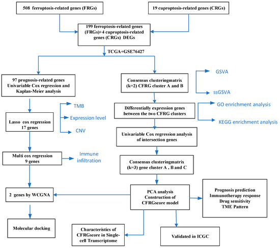 The mRNA sequencing and matching clinical details were downloaded from TCGA and GSE76427 (Among HCC patients, 46% had HBV infection, and 54% had cirrhosis). Additionally, CFRG lists were collected from the previous studies and FerrDb website (http://www.zhounan.org/ferrdb/, accessed on 13 December 2023), respectively. Subsequently, the UCSC Xena server (https://xena.ucsc.edu/, accessed on 15 December 2023) was utilized to retrieve somatic mutation and copy number variation (CNV) data of liver hepatocellular carcinoma (LIHC). In addition, the LIRI-JP data were obtained from the ICGC (International Cancer Genome Consortium) database to validate the predictive model. Figure 13 presents the flow diagram of this study.