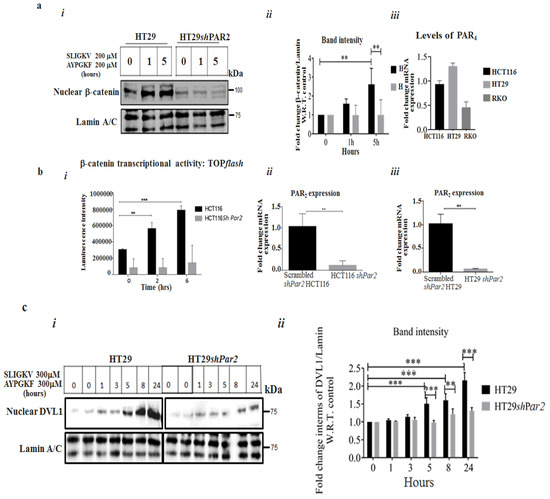 Upon the knockdown of Par2 alone, the inhibition of the induced β-catenin level signaling was obtained (Figure 1a(i),a(ii)). High expression levels of both Par2/f2rl1 and Par4/f2rl3 (in addition to other oncogenes) were observed in HCT116 and HT29 cells (Figure 1a(iii)). Significantly, while we previously demonstrated evidence of the potent individual activation of β-catenin stabilization [12,14,40] by PAR2 via the addition of SLIGKV peptide or by PAR4 via AYPGKF peptide, we now aimed to elucidate the relative impact of PAR2 on PAR2 and PAR4 function. For the assessment of the relative impact of Par2/f2rl1 on pro-tumor signaling, we knocked down Par2 using shRNA-Par2 in colon-cancer-cell lines (i.e., HCT116 and HT29). Decreased Par2 levels were observed, compared with those in scrambled shPar2-infected cells (Figure 1b(ii),b(iii)). When combined, the SLIGKV and AYPGKF peptides induced the activation of PAR2 [12] and PAR4, leading to induced β-catenin stabilization. Along this line, an increased TOPflash reporter activity of β-catenin transcription function was obtained following PAR2 and PAR4 activation. When Par2 was knocked down, a marked inhibition of PAR2 and PAR4-induced TOPflash activity was observed (Figure 1b). When levels of β-catenin were evaluated in HT29 cells, high β-catenin levels were seen following peptide SLIGKV- and AYPGKF-mediated PAR2 and PAR4 activation. Upon the silencing of Par2 RNA levels (it is assumed that under these conditions, levels of their respective protein levels are reduced accordingly, although not measured directly) in HT29 cells, a marked inhibition of β-catenin level was seen (Figure 1a(i)–(iii)). The activation of PAR2 induced DVL localization into the cell nucleus. Nuclear DVL now becomes part of a transcriptional complex composed, among others, of c-Jun, β-catenin, and Tcf [41]. While abundant nuclear DVL1 levels were observed following the activation of both PAR2 and PAR4, (Figure 1c(i),c(ii)), upon Par2 knockdown, a significant inhibition of nuclear DVL1 level was obtained. Overall, these results point to the essential requirement of PAR2 expression for PAR2 and PAR4-induced β-catenin stabilization events.
