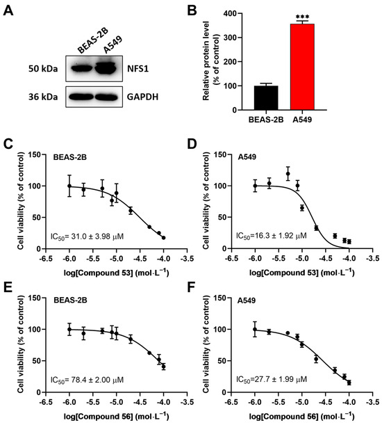 The effects of Compounds 53 and 56 on the proliferation of normal human bronchial epithelial cells (BEAS-2B) and lung adenocarcinoma cells (A549). (A,B) The expression levels of NFS1 in BEAS-2B and A549 cells, respectively (n = 3). (C,D) The cell viability assays of BEAS-2B and A549 cells treated with varying concentrations of Compound 53 for 72 h (n = 6). (E,F) The cell viability assays of BEAS-2B and A549 cells treated with varying concentrations of Compound 56 for 72 h (n = 6). Data are presented as the means ± SD. *** p < 0.001.
