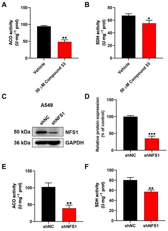 Previous findings suggest that NFS1 suppression leads to an insufficient supply of Fe-S clusters, which subsequently affects the activities of intracellular Fe-S proteins [25,26]. To investigate the effects of Compound 53 on Fe-S cluster biosynthesis via NFS1 inhibition, we measured the activities of two Fe-S cluster-containing enzymes, aconitase (ACO) and succinate dehydrogenase (SDH), in A549 cells. The results revealed that treating A549 cells with 50 µM of Compound 53 decreased the activities of ACO and SDH to 51.3% and 81.8%, respectively, compared to the control group (Figure 3A,B). To assess whether Compound 53 specifically targeted NFS1 in cells, NFS1 was knocked down in A549 cells using small interfering RNA (siRNA). As shown in Figure 3C,D, the protein expression level of NFS1 decreased to approximately 30% of that in the control group. Consequently, the activities of ACO and SDH were significantly reduced in NFS1-knockdown cells (Figure 3E,F), consistent with the observations in Compound 53-treated cells. These results indicate that Compound 53 likely inhibits the activities of ACO and SDH in cells by disrupting Fe-S cluster biosynthesis through the direct inhibition of NFS1 activity.