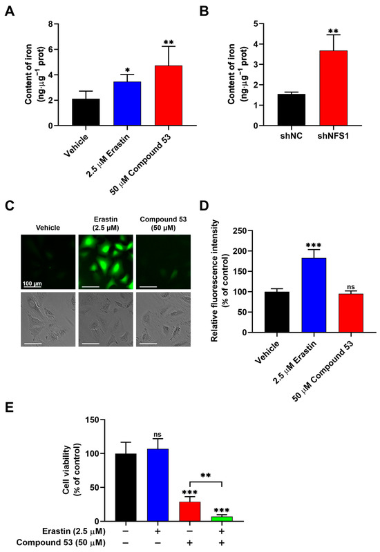 Previous studies have reported that the suppression of NFS1 can activate the iron starvation response, leading to increased iron absorption by cells [27,28,29]. To assess the effect of Compound 53 on cellular iron levels, we measured the total iron content in A549 cells treated with 50 µM of Compound 53 and 2.5 µM of Erastin (a ferroptosis inducer), respectively. As shown in Figure 4A, treatment with Compound 53 significantly increased the cellular iron content, similar to the effect of the well-recognized ferroptosis inducer, Erastin. Increased cellular iron levels were also observed in NFS1-knockdown A549 cells (Figure 4B), consistent with previous reports [26]. These results suggested that treatment with Compound 53 produced a similar effect to NFS1 gene silencing in A549 cells. However, unlike cells exposed to Erastin, treatment with Compound 53 did not significantly affect intracellular ROS levels (Figure 4C,D).