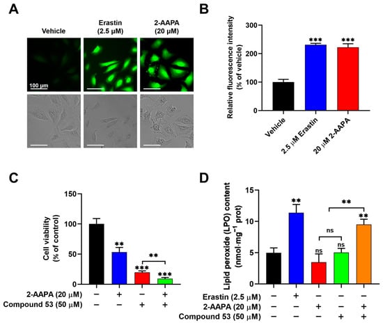 To evaluate whether the combination of Compound 53 and 2-AAPA induced ferroptotic cell death, we measured intracellular lipid peroxide (LPO) levels, a well-recognized indicator of ferroptosis. As shown in Figure 5D, compared to the elevated LPO levels observed in cells treated with Erastin (2.5 µM), no significant changes in intracellular LPO levels were observed following treatment with either Compound 53 (50 µM) or 2-AAPA (20 µM) alone. However, the combination of Compound 53 and 2-AAPA remarkably increased LPO levels in A549 cells. Collectively, these results demonstrated that elevated levels of cellular iron and ROS, induced by Compound 53 and 2-AAPA, respectively, can cause cell death via ferroptosis.