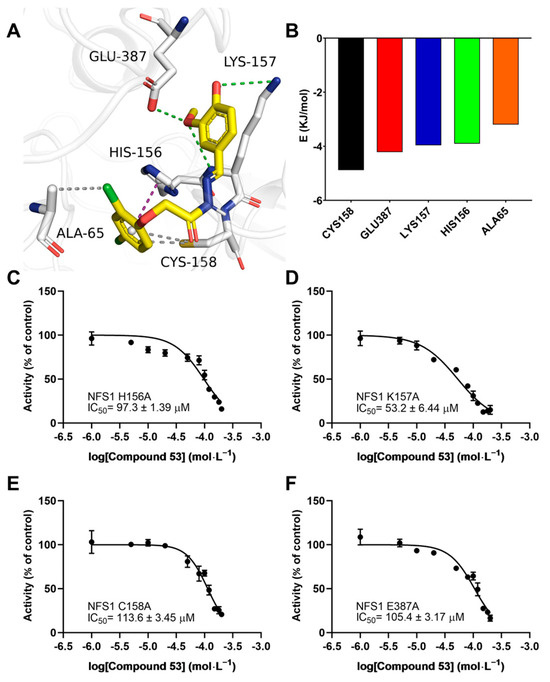 Interaction analysis of the simulated NFS1–Compound 53 complex. (A) A snapshot from the simulated Compound 53–NFS1 complex at the end of a 200 ns molecular dynamics (MD) simulation. Key amino acid residues involved in the interaction between Compound 53 and NFS1 are shown. Green represents hydrogen bonds, magenta denotes π-π stacking interactions, and gray indicates hydrophobic interactions. (B) Total energy contribution of each amino acid residue in the NFS1 protein. (C–F) Dose–response curves of Compound 53 with the H156A NFS1, K157A NFS1, C158A NFS1, and E387A NFS1 mutants (n = 4). Data are presented as the means ± SD.