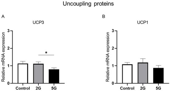 2.1. UCP3 mRNA Expression Is Downregulated in 5G-Exposed Rats Compared to Those Exposed to 2G