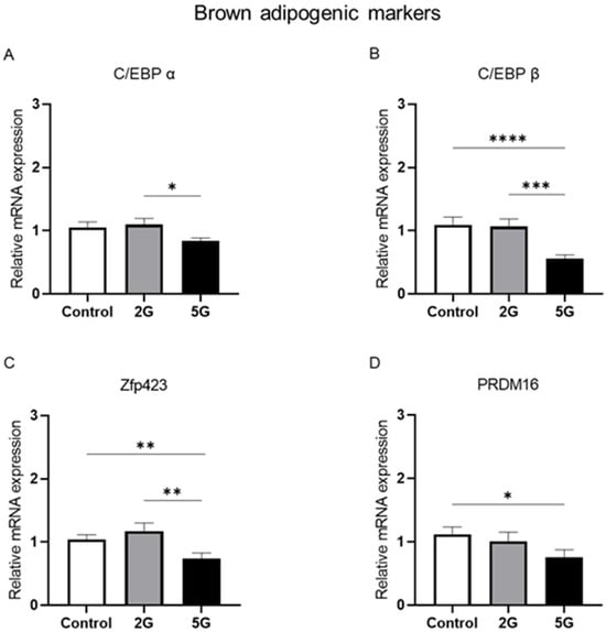 Seewooruttun, C.; Bouguila, B.; Corona, A.; Delanaud, S.; Bodin, R.; Bach, V.; Desailloud, R.; Pelletier, A. 5G Radiofrequency Exposure Reduces PRDM16 and C/EBP β mRNA Expression, Two Key Biomarkers for Brown Adipogenesis. Int. J. Mol. Sci. 2025, 26, 2792. https://doi.org/10.3390/ijms26062792
