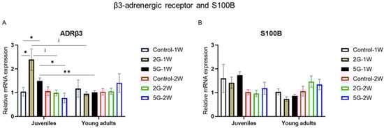 2.4. ADRβ3 mRNA Expression Was Modulated by Age, Exposure Duration, and RF Exposure