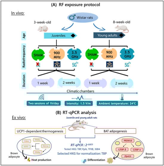- Maalouf, J.; Pelletier, A.; Corona, A.; Gay-Quéheillard, J.; Bach, V.; de Seze, R.; Selmaoui, B. Dose- and Time-Dependent Effects of Radiofrequency Electromagnetic Field on Adipose Tissue: Implications of Thermoregulation and Mitochondrial Signaling. Int. J. Mol. Sci. 2023, 24, 10628. [Google Scholar] [CrossRef]