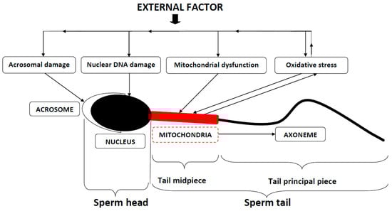 | Heavy metals | Various industrial goods | Spermatogenesis Sperm motility Sperm count Teratozoospermia Sperm viability | Endocrine disruption Oxidative stress DNA damage Androgene synthesis | [65,66] |