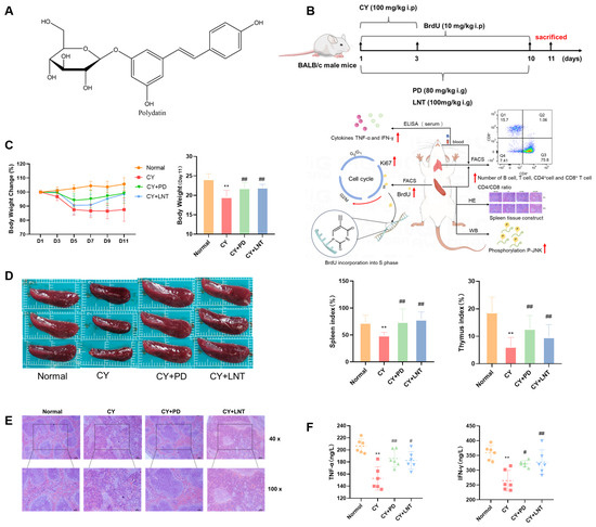 PD is a natural resveratrol derivative with high bioavailability [30] and multiple pharmacological activities such as neuroprotection [31,32], antioxidation, and anti-inflammation [33]. Previous studies have confirmed that PD can regulate the immune function [34]. In this study, we explored the effects of PD in a CY-induced immunosuppression model. CY is a widely used immunosuppressive agent that suppresses immune system function, leading to body weight loss and atrophy of the spleen and thymus organs, which are critical for maintaining immune homeostasis [35,36,37].