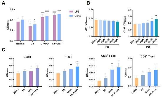 PD stimulated splenic lymphocyte proliferation in vivo and in vitro. ConA-induced T lymphocyte and LPS-induced B lymphocyte proliferation (n = 6) (A). The LDH level was analyzed using an LDH assay kit and cell proliferation was measured using a CCK-8 assay (n = 3) (B). Comparison of purity of splenocyte subsets before and after magnetic bead sorting (C). After stimulation with PD, the proliferation of each subset was highly increased, which was further enhanced when combined with ConA or LPS. Data are expressed as mean ± SD. * p < 0.05 and ** p < 0.01 vs. DMSO group; #### p < 0.0001 vs. CY group.