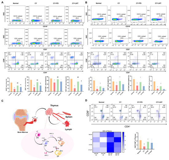 T cells were classified into helper T cells (CD4+ T cells) and cytotoxic T cells (CD8+ T cells) according to their distinct antigens and function. The frequencies of lymphocyte subsets were evaluated using flow cytometry. Compared with the Normal group, the percentages of B cells, CD3+ T cells, CD4+ T cells, and CD8+ T cells in the peripheral blood and spleen isolated from the CY group were significantly decreased; all then recovered after treatment with PD (Figure 3A,B). T lymphocytes principally developed in the thymus (Figure 3C) [25]. Originating from shared precursors, CD3+ cells are initially expressed with CD4− and CD8− double-negative (DN) T cells, which subsequently develop into CD4+ and CD8+ double-positive (DP) T cells and selectively differentiate into SP cells (CD4+ or CD8+ T cells) [26,27,28]. As shown in Figure 3D, CY inhibited the percentages of DN but induced the percentages of DP and CD8+ SP T cells, leading to a significant decrease in the CD4+/CD8+ ratio. However, PD administration alleviated the interference of CY on T lymphocyte development and differentiation (Figure 3D) in the thymus.