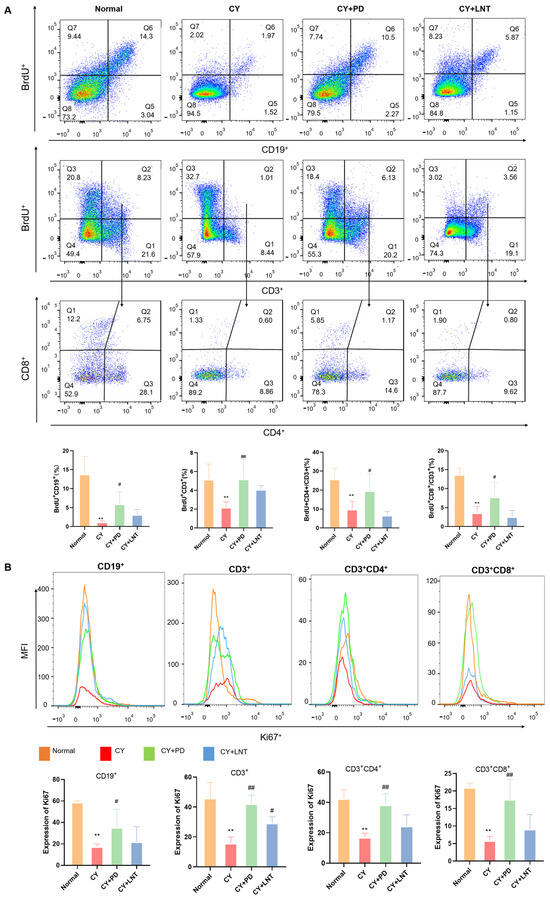 PD promoted the percentages of BrdU and expressions of Ki67 in the spleen of CY-induced immunosuppressed mice. The intensities of BrdU and Ki67 in splenic subsets were measured and are shown (A,B) for the Normal, CY, CY+PD, and CY+LNT groups. Data are expressed as mean ± SD. ** p < 0.01 vs. Normal group; # p < 0.05 and ## p < 0.05 vs. CY group (n = 6).