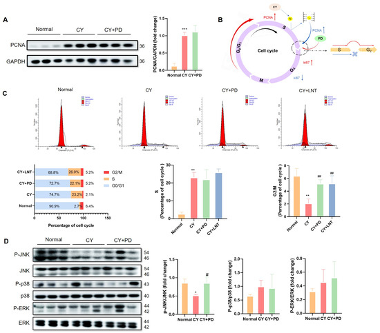 PD regulated the cell cycle and the proliferation-related MAPK/JNK pathway. Representative images of PCNA proteins were tested using a Western blot (WB) (A). Schematic diagram of the effects of CY and PD on cell cycle (B). The cell cycle in splenic lymphocytes was measured and is shown for Normal, CY, CY+PD, and CY+LNT groups (C). Representative images of the Western blot (WB) of phosphorylated MAPK proteins (D). All experiments were performed in triplicate, and molecular weight (KDa) is labeled on the right. Data are expressed as mean ± SD. * p < 0.05, ** p < 0.01, *** p < 0.001 vs. Normal group; # p < 0.05, ## p < 0.01 vs. CY group.