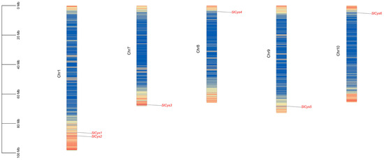 Localization analysis of SlCys genes on tomato chromosomes. Scale indicates the length of the chromosome. Chromosome color from blue to red indicates gene density (blue: less dense; red: more dense).