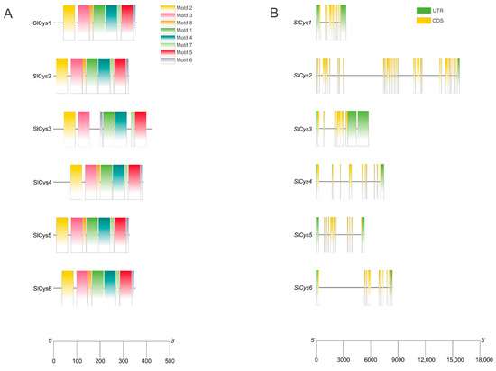 (A) Conserved motif analysis of SlCys family proteins, with scale indicating amino acid length. (B) Structural analysis of SlCys genes. The scale indicates gene length and black lines indicate introns.