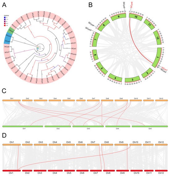 (A) Phylogenetic tree of tomato, Arabidopsis, and potato Cys proteins. (B) Collinearity among SlCys family genes in tomato. The scale indicates chromosome length, and the gray lines indicate collinearity among tomato non-SlCys family genes. (C) Synteny between tomato Cys genes and Arabidopsis Cys genes. Tomato chromosomes are shown in orange and Arabidopsis chromosomes in green. Gray lines represent synteny between non-Cys genes, and red lines represent synteny between Cys genes. (D) Synteny between tomato Cys genes and potato Cys genes. Tomato chromosomes are shown in orange and potato chromosomes in red. Gray lines represent synteny between non-Cys genes, and red lines represent synteny between Cys genes.