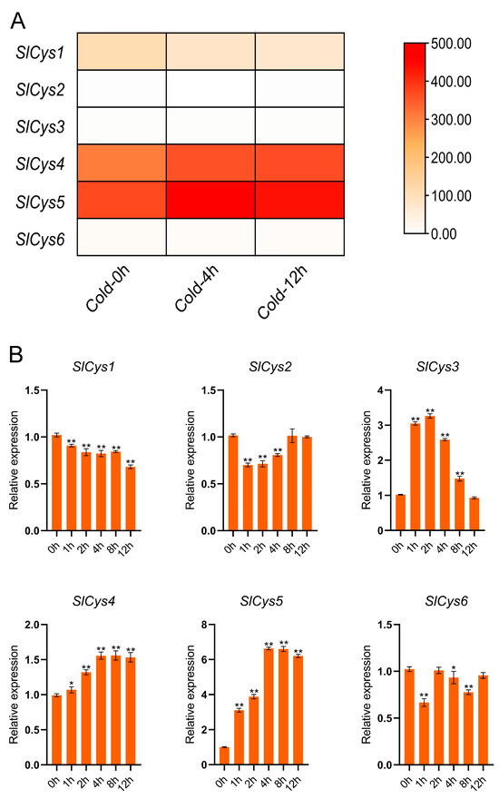 (A) Heatmap of transcriptome data of SlCys genes under cold stress. (B) Expression patterns of SlCys family genes under cold stress based on qRT-PCR experiments. Error bars indicate the standard error of the mean (n = 3). The significance test was performed using the one-way ANOVA method, with the significance mark (*) indicating p < 0.05 and (**) indicating p < 0.001.