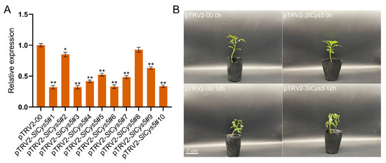 (A) Silencing efficiency assay of the SlCys5 gene in tomato. Error bars indicate the standard error of the mean (n = 3). The significance test was performed using the one-way ANOVA method, with the significance mark (*) indicating p < 0.05 and (**) indicating p < 0.001. (B) Phenotypes of SlCys5-silenced plants and control plants under cold stress.