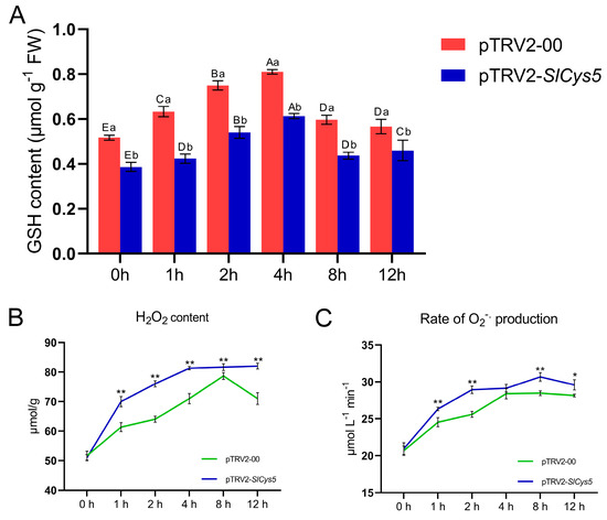 (A) GSH content in Slcys5-silenced plants and control plants under cold treatment. Error bars indicate the standard error of the mean (n = 3). Significance was analyzed at the 0.05 significance level using the two-way ANOVA method. Capital letters indicate significant differences between different time courses of the same experimental plant material, and lowercase letters indicate significant differences between different experimental plant materials at the same time. (B) H2O2 content in Slcys5-silenced plants and control plants under cold treatment. (C) Rate of O2−• production in Slcys5-silenced plants and control plants under cold treatment. Error bars indicate the standard error of the mean (n = 3). The significance test was performed using the one-way ANOVA method, with the significance mark (*) indicating p < 0.05 and (**) indicating p < 0.001.