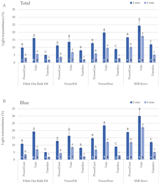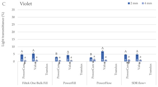 Total (A), blue (B) and violet (C) light transmittance (mean values ± 1 standard deviation) of the tested materials measured at 2 and 4 mm depth. Identical uppercase letters denote statistically similar groups within each material (comparisons among 3 curing units) at 2 mm depth. Identical lowercase letters denote statistically similar groups within each material (comparisons among 3 curing units) at 4 mm depth. Identical Greek letters denote statistically similar groups within a curing unit (comparisons among materials).