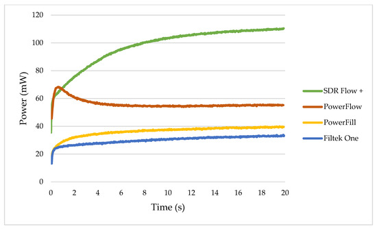 SDR+ had the highest total and blue light transmission, followed by Tetric PowerFlow, Tetric PowerFill and Filtek One. This trend generally correlates with the increasing filler content [11,12,19,21,62]. However, exceptions were observed in SDR+ and Tetric PowerFlow, which have a similar filler content but differ in resin compositions. SDR+ is characterised by larger filler particles (approx. 20 µm), which results in a smaller surface area for light scattering [19,20,21]. SDR+ is also known for its high light transmittance [11,19,63], which constantly increases with polymerisation time. The other three materials in this study are characterised by the increasing refractive index mismatch between the fillers [33,40]. It is noteworthy that the opacity of Tetric PowerFlow increased quickly after the initiation of polymerisation, characterised by a short (0.6 s) increase in light transmittance, followed by its decline to the end of the measurement (Figure 2). This trend probably explains why Tetric PowerFlow has a lower overall and blue light transmission than SDR+ despite a lower filler volume.