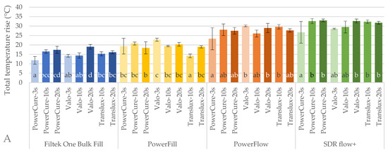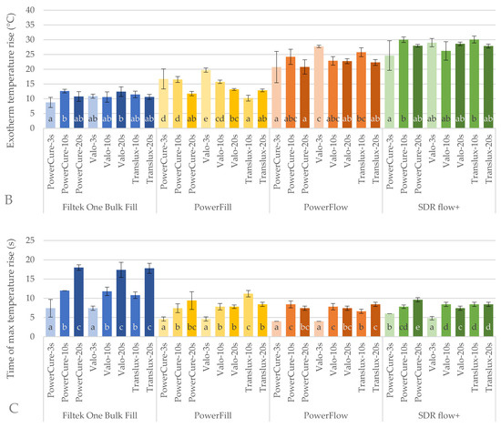 Total (A) and exotherm (B) temperature rise as well as the time to reach maximum temperature rise (C) (mean values ± 1 standard deviation) during 5 min post-illumination start of the tested materials measured at 4 mm depth. Identical letters denote statistically similar groups within each material.