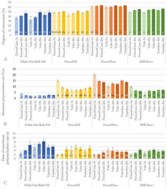 Degree of conversion attained after 5 min post-illumination (A), maximum reaction rate (B) and time to reach maximum polymerisation rate (C) (mean values ± 1 standard deviation) of tested materials measured at 4 mm depth. Identical letters denote statistically similar groups within each material.
