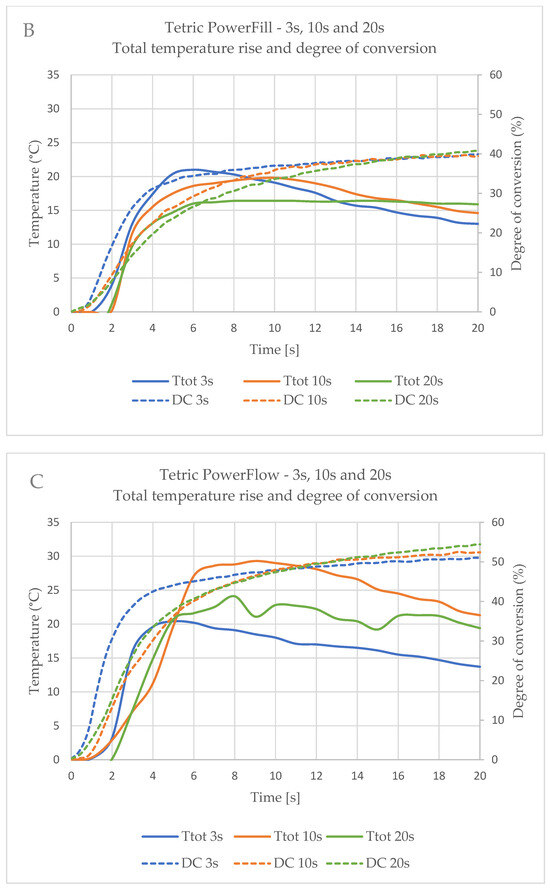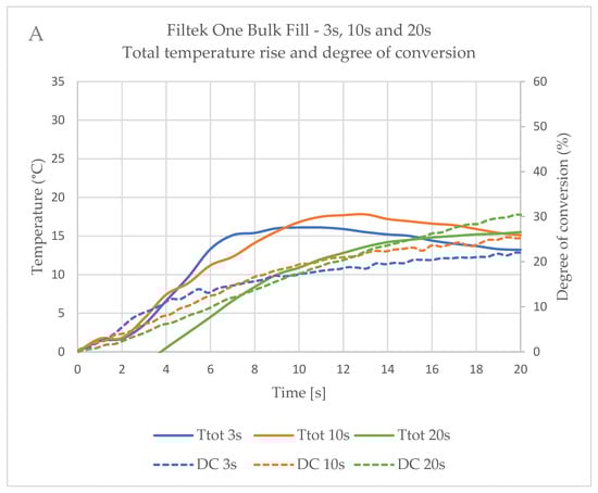 Contrary to temperature rise, the time to reach the maximum temperature () was the greatest for Filtek One, especially for longer curing times (Figure 3C). The 3s curing protocol, regardless of the curing unit, influenced the shortest . The time when the maximum temperature was reached for 3s protocols exceeded the illumination time.