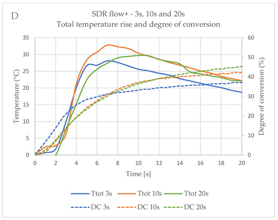 Total temperature rise (Figure 3A) ranged from 11.8 ± 2.0 °C for Filtek One with 3s protocol with Bluephase PowerCure to 32.6 ± 1.3 °C for SDR flow+ with 10s protocol with the same curing unit. Both total and exotherm temperature rise values were always the highest for SDR+ followed by Tetric PowerFlow, Tetric PowerFill and Filtek One with the lowest temperature rise. The exception is the 3s polymerisation protocol with Valo Cordless, which caused greater total temperature rise for Tetric PowerFlow than for SDR+. This difference was not present for the exotherm temperature rise.