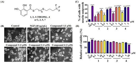 Previous studies discovered gentisides with NGF-mimic effects derived from Gentiana rigescens Franch, along with the synthesis of hundreds of alkyl benzoate derivatives. These derivatives were designed to enhance NGF-mimic activity while reducing cytotoxicity through the transformation of thioester and the introduction of sulfur atoms in the alkyl chain []. However, the water solubility and bioavailability of these derivatives remained insufficient. To address these issues, structural modifications were implemented, including adjustments to the alkyl chain length to improve water solubility and substitution of the terminal methyl group’s hydrogen atom with fluorine to enhance bioavailability. The synthetic route is shown in Figure S1. A series of thioester compounds (labeled 1–4) with alkyl chain lengths ranging from 7 to 13 carbons were successfully synthesized, as illustrated in Figure 1A. The NGF-mimic effects of these compounds on PC12 cells were subsequently evaluated. The percentage of PC12 cells exhibiting neurite growth increased in a dose-dependent manner following treatments with compounds 1–4 at doses of 0.3, 1, and 3 µM, respectively. Compounds 3 and 4 displayed superior activity in promoting neurite outgrowth (Figure 1B,C).