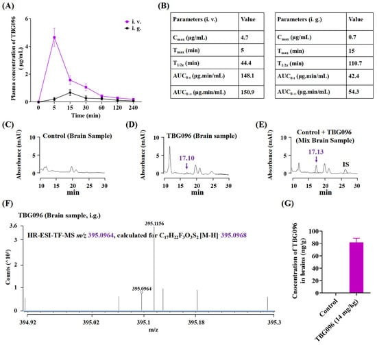 Pharmacokinetic analysis of TBG096 in plasma and brain samples. (A) Drug concentration-time curve of TBG096 following a dose of 14 mg/kg by intravenous (i.v.) or oral administration (i.g.) in rats (n = 5 rats per group). (B) Parameters of TBG096 after intravenous or oral administration in rats. (C–E) HPLC analysis results of brain homogenate samples in control and TBG096 group (14 mg/kg) after 15 min of single oral administration and HPLC spectra of mixed control sample (including TBG096 and internal standard (IS, compound 4)). (F) HR ESI-TOF-MS spectrometry of collected HPLC peak from brain samples after 15 min of a single oral administration of TBG096 (14 mg/kg). (G) The concentration of TBG096 in brain samples following a single dose of 14 mg/kg by oral administration in rats (n = 4 rats per group).