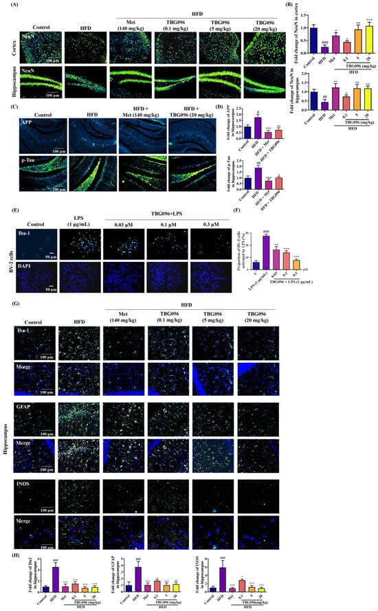 Key pathological features of AD include the loss of neurons []. To evaluate the effects of TBG096 on neuronal integrity, immunofluorescence staining was performed on the cerebral cortex and hippocampus of AD mice. The analysis revealed marked reductions in mature neurons, increased APP, and phosphorylated Tau proteins due to long-term HFD feeding, which were notably reversed following TBG096 treatment, indicating that TBG096 has a neuroprotective effect (Figure 3). Neuroinflammation is another major contributor to AD pathology, driven primarily by astrocytes and microglia []. The effects of TBG096 on microglial and astrocytic activity as well as INOS levels were assessed (Figure 3).