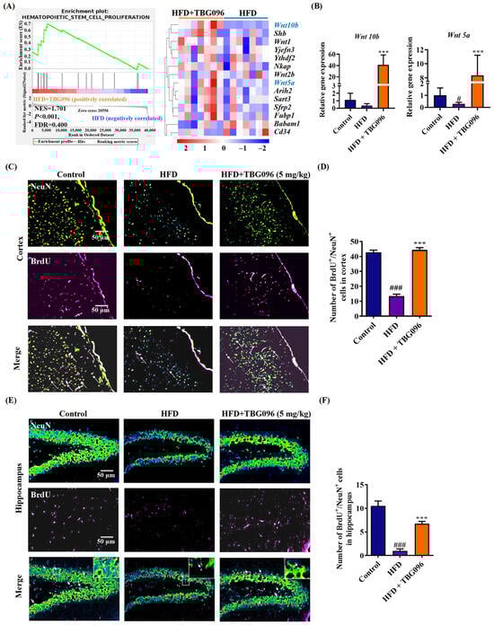 Effects of TBG096 on newborn neurons in HFD-induced AD model. (A) GSEA-GO enrichment plot and heat map of the HFD + TBG096 group compared with the HFD-only group regarding gene expression changes in hematopoietic stem cell proliferation in brain samples of the HFD model. The heat map shows the Z-score value distribution of gene expression. Red and blue color represent up- and down-regulation, respectively. (B) Relative gene expression level of Wnt10b and Wnt5a in brain samples of the HFD model. (C) Fluorescent images and (D) digital results of NeuN and BrdU staining neurons in the cerebral cortex of HFD-induced AD mice. (E) Fluorescent images and (F) digital results of NeuN and BrdU staining neurons in the hippocampus of HFD-induced AD mice. The white arrows indicate cells that are double-stained with NeuN and BrdU antibodies in (C,E). The data are presented as mean ± SEM. # and ### indicate a significant difference at p < 0.05 and p < 0.001 compared with the normal control; *** indicates a significant difference in comparison with the HFD group at p < 0.001.