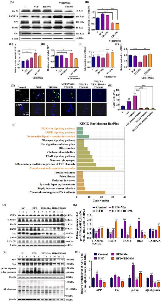 The signaling pathway in which TBG096 works. (A) Western blot analysis and (B–F) digital results of Hsc70, LAMP2A, APP, PKM2, and HK2 proteins in PC12 cells. (G) Fluorescent images and (H) digital results of EdU and DAPI staining in PC12 cells. (I) KEGG enrichment bar plot of the HFD + TBG096 group compared with the HFD-only group for brain tissue. (J) Western blot analysis and (K) digital results of AMPK, p-AMPK, Hsc70, PKM2, HK2, and LAMP2A proteins in the cerebral cortex of HFD-induced AD mice. (L) Western blot analysis and (M) digital results of APP, Tau, p-Tau, and Aβ oligomers proteins in the cerebral cortex of HFD-induced AD mice. *, **, and *** indicate significant differences at p < 0.05, p < 0.01, and p < 0.001 in (B–F). ** and *** indicate significant differences at p < 0.01 and p < 0.001 compared with the control in (H); ### indicate significant differences at p < 0.001 in (H). #, ##, and ### indicate significant differences at p < 0.05, p < 0.01, and p < 0.001 compared with the normal control in (K,M); ** and *** indicate significant differences at p < 0.01 and p < 0.001 compared with the HFD-only group in (K,M).