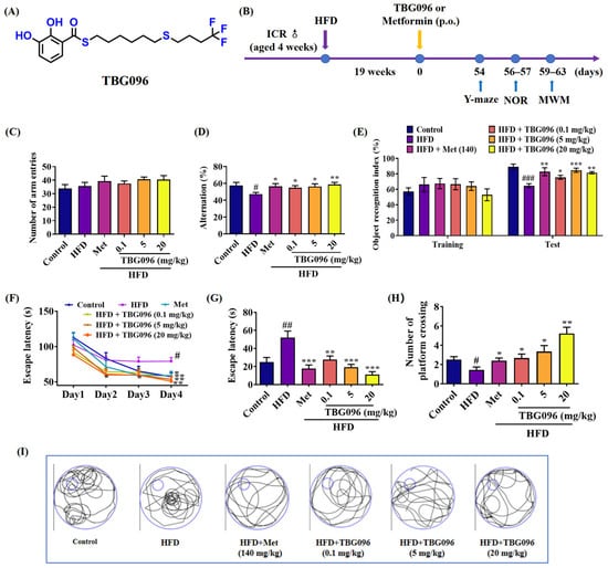Changes in learning memory and spatial memory of HFD-induced AD mice after administering TBG096. (A) The chemical structure of TBG096. (B) Schedule of animal experiment for efficacy evaluation of TBG096 in HFD-induced AD mice. (C) Changes in the number of arm entries and (D) percentage of alternation in the Y-maze test of HFD-induced AD mice. (E) Percentage of object recognition index in the NOR experiment of HFD-induced AD mice. (F) Escape latency in the training phase of MWM test of HFD-induced AD mice. (G) Escape latency and (H) platform crossing numbers in the test phase of the MWM test of HFD-induced AD mice. (I) Images of platform crossing trajectory. The big circle represents the pool of the water maze, the small circle represents the platform position, and the curve represents the swimming exploration trajectory. The data are presented as mean ± SEM (n = 10 mice per group). #, ##, and ### indicate significant differences in comparison with the control group at p < 0.05, p < 0.01, and p < 0.001. *, **, and *** indicate significant differences in comparison with the HFD group at p < 0.05, p < 0.01, and p < 0.001, respectively.
