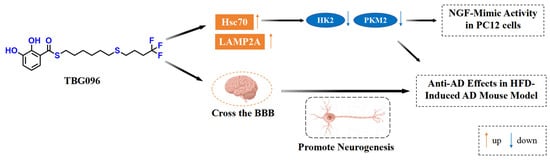 In conclusion, this study confirms TBG096 as a promising candidate drug for AD. This molecule has good bioavailability and can cross the BBB. TBG096 exerted NGF-mimic activity by Hsc70 and produced anti-AD effects in HFD-induced AD mice via promoting neurogenesis (Figure 7). In the future, we will examine the potential limitations of TBG096, such as its long-term safety, impact on non-neuronal cells, and synergistic side effects with other AD treatment strategies. Meanwhile, we will focus on identifying the binding targets and binding sites of TBG096 and verify whether these proteins are indeed therapeutic targets responsible for the anti-AD effects of TBG096.