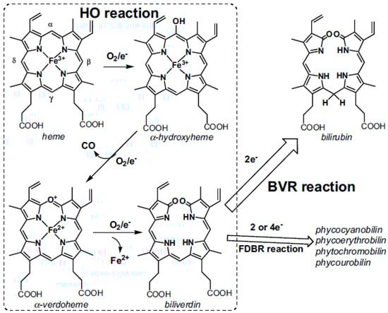 - Sugishima, M.; Wada, K.; Fukuyama, K. Recent Advances in the Understanding of the Reaction Chemistries of the Heme Catabolizing Enzymes HO and BVR Based on High Resolution Protein Structures. Curr. Med. Chem. 2020, 27, 3499–3518. [Google Scholar] [CrossRef]
