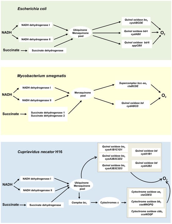 - Poole, R.K.; Cook, G.M. Redundancy of aerobic respiratory chains in bacteria? Routes, reasons and regulation. Adv. Microb. Physiol. 2000, 43, 165–224. [Google Scholar] [CrossRef]