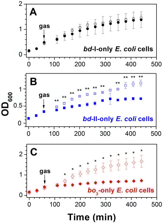 3.1. Effect of CO on E. coli Cell Growth and Aerobic Respiration