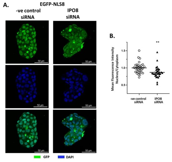 (A) Representative confocal pictures of T47D cells transfected with plasmid expressing the EGFP-NLS8 fusion (EGFP-NLS8), which is recognized by importin 8, in the presence of either a specific siRNA for importin 8 (IPO8) or a negative control siRNA. Nuclei were stained with DAPI (blue). Magnification 400×. (B) Mean fluorescence intensity in the nucleus and cytoplasm was quantified (see Section 4 for details) in at least 30 images with approximately 40 cells, per condition, and is given as the Nucleus/Cytoplasm fluorescence ratio. ** denotes statistical significance p < 0.01.