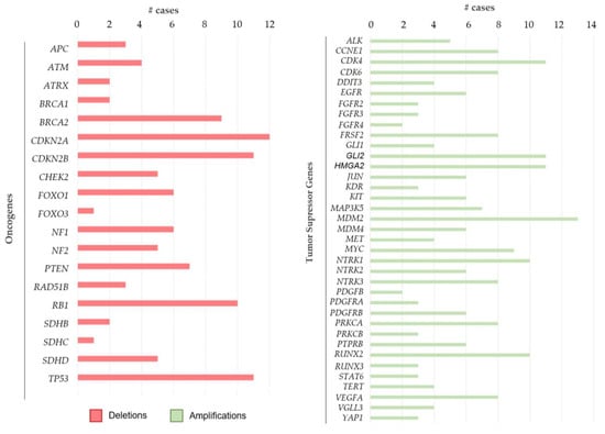 - Lopes-Brás, R.; Lopez-Presa, D.; Esperança-Martins, M.; Melo-Alvim, C.; Gallego, L.; Costa, L.; Fernandes, I. Genomic Profiling of Sarcomas: A Promising Weapon in the Therapeutic Arsenal. Int. J. Mol. Sci. 2022, 23, 14227. [Google Scholar] [CrossRef] [PubMed]