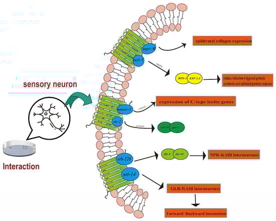 C. elegans, a free-living nematode found in soil and decaying organic matter, primarily feeds on bacteria but is vulnerable to pathogenic microorganisms []. Communication between C. elegans and bacteria encompasses two main aspects. Firstly, C. elegans can be infected by pathogenic microorganisms []. The natural pathogens and parasites that infect C. elegans were first described in 2008 and 2011 [,]. Secondly, Escherichia coli OP50, utilized as a food source in laboratory settings, plays a significant role in this interaction []. C. elegans possesses the ability to recognize various pathogens and initiate distinct immune responses accordingly [,]. The nervous system processes input signals from infected local sites, integrating them to coordinate immune response mechanisms. The microbial sensing mechanism primarily activates molecular immune pathways, enhancing resistance to pathogens by reducing their presence and eliminating infections. Research had shown that the mechanisms involved in the initial activation of defense pathways also regulate the immune system. Consequently, immune regulatory mechanisms are crucial for maintaining immune homeostasis, as excessive activation of immune pathways can be detrimental to the host. Nematodes utilize these mechanisms to adapt and respond to external pathogens [,]. While E. coli is the primary food source for C. elegans, food selection also constitutes an essential adaptive strategy for these nematodes. During food selection, chemical communication between E. coli and C. elegans enhances the expression of specific GPCR receptors.